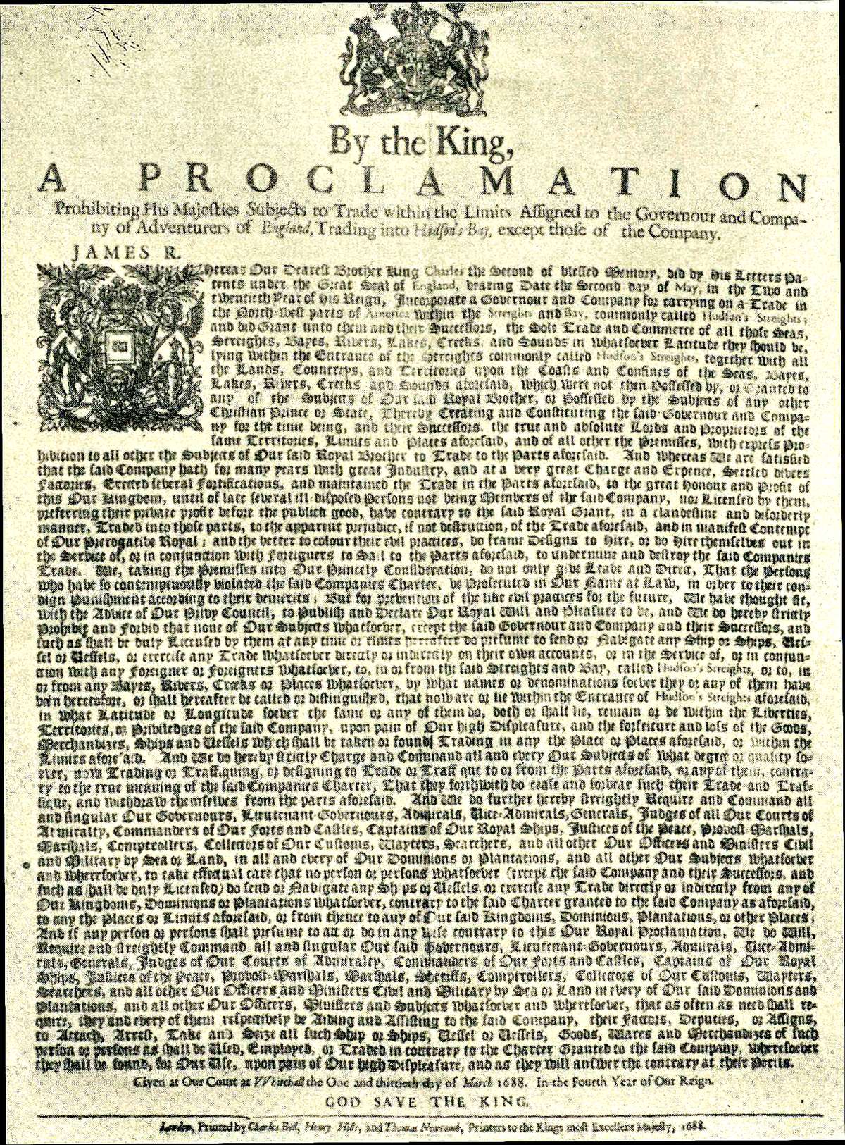 There are one hundred and one proclamations entered in this volume. They have been carefully transcribed from the printed broadsides, except in the few instances where the broadside could not be found and some other source had to be used. Above each proclamation the date is given, and also a descriptive heading supplied by the editor and enclosed in brackets. The notes serve chiefly to explain obscure points, or to refer to original sources for certain Acts printed in the text. The bibliographical information entered at the end of each document gives the size of the original broadside, a list of libraries where it is to be found, a reference regarding the entry of the proclamation upon the Patent Roll, Crown Office Docquet Book, or Privy Council Register, and a note of the fact as to whether it is reprinted elsewhere. A list of the libraries referred to as containing the broadsides, and a chronological list of the proclamations precede the body of the text. The frontispiece reproduction of a proclamation of 1688 is from an original broadside owned by the John Carter Brown Library.