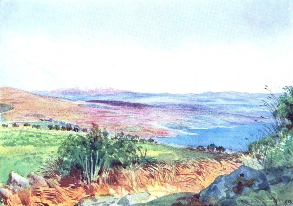 be the scene of the miracle of the Loaves and Fishes. It is very difficult to describe to you my enchantment at seeing one after another these places I have longed to see from early childhood, when our beloved father used to read us the Bible every Sunday. The lake was pale and calm, delicately tinted, and there was a heat-haze over everything in the early part of the day. We disembarked under some thorny acacias which gave a deep shade, and I had the delight of making a sketch there of the coast, looking westward, whilst W. went on by boat to the Jordan. Rosy oleanders fringe the water as far as the eye can reach; the “Mount of Beatitudes” and top of Tabor are in the distance, and the site of Capernaum in the middle distance. God has trodden these scenes with human feet; the feeling of sketching them is scarcely to be put before you in words.