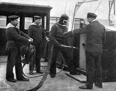 | Fire-Drill on a German Liner: Hose from Bellows Supplies Fresh Air to Man with Smoke Helmet | 25 |