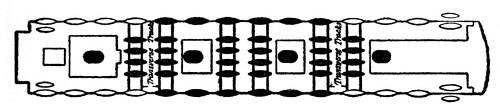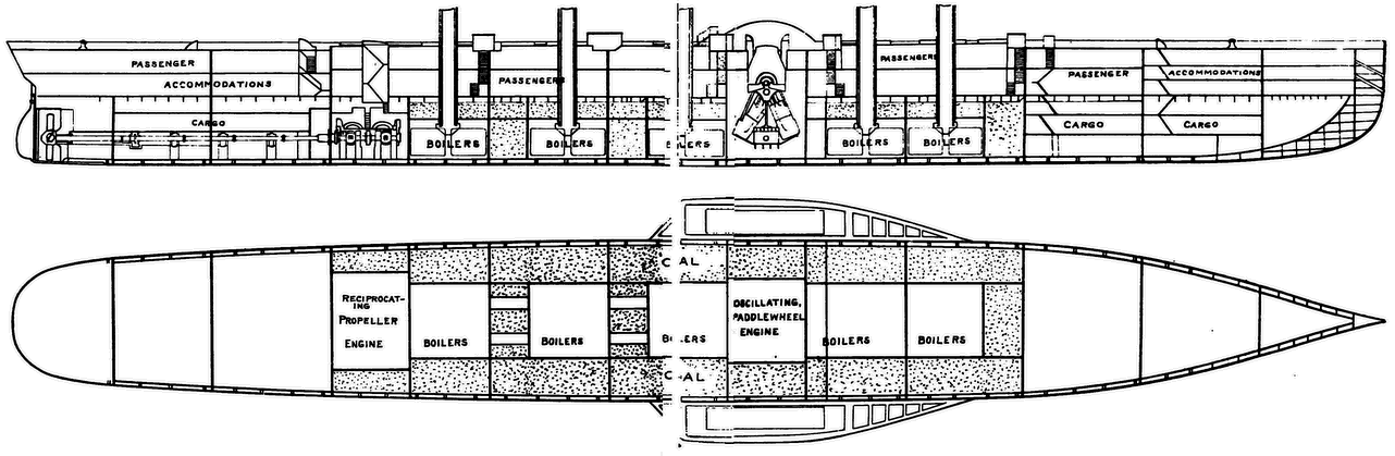 (e) The cargo spaces in compartments 3 and 4, lying below the middle deck, should be divided by a central longitudinal bulkhead, and the hatches, leading up from these holds, should be enclosed in watertight casings extending, without any openings, to the shelter deck, where they should be closed by watertight hatch covers. The huge reciprocating-engine-room should be divided by a similar, central, longitudinal bulkhead.