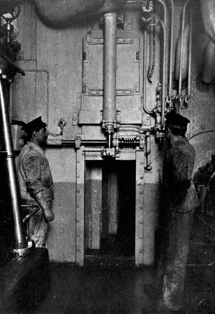 Moreover, in some of the latest battleships of the dreadnought type the practice has been followed of permitting no doors of any description to be cut through the bulkheads below the water-line. Access from one compartment to another can be had only by way of the decks above. Furthermore, all the openings through the protective deck are provided with strong watertight hatches or, as in the case of the openings for the smoke stacks, ammunition-hoists, and ventilators, they are enclosed by watertight steel casings, extending to the upper decks, far above the water-line.