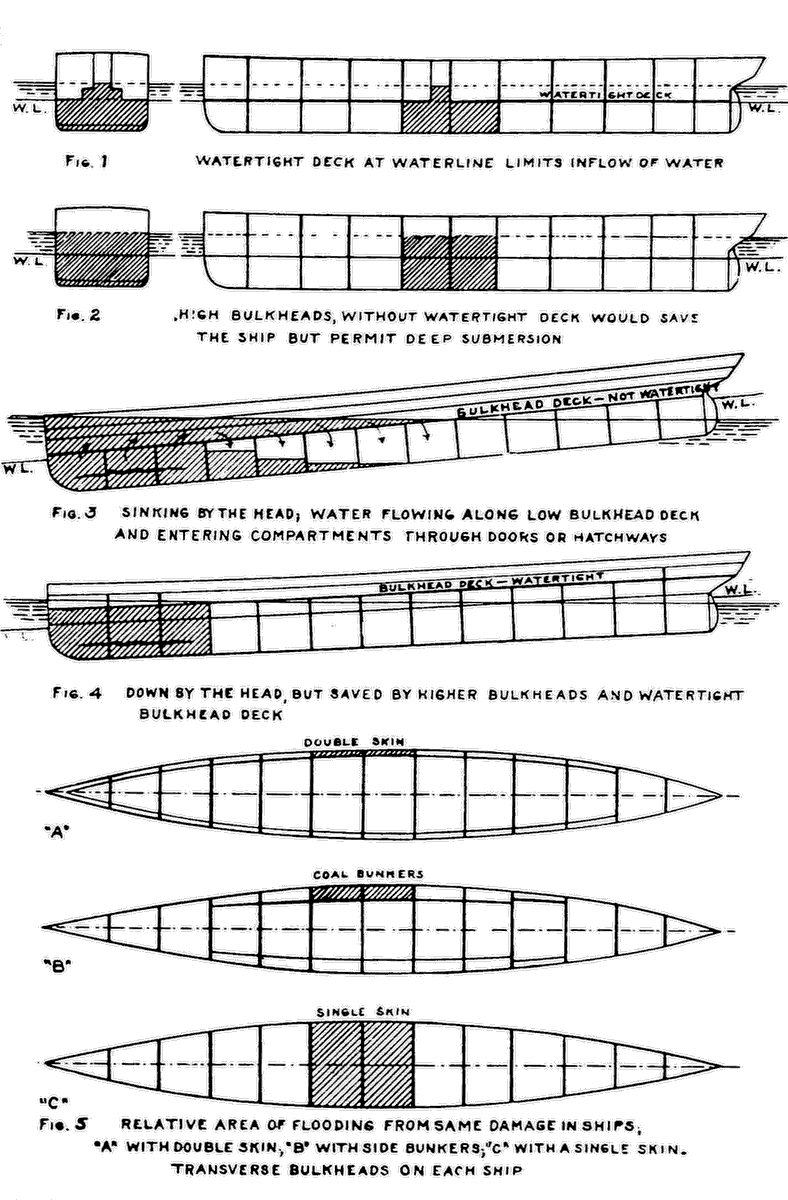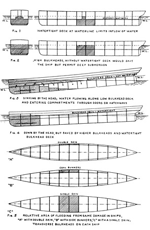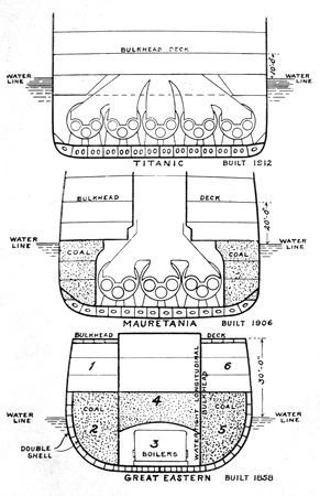 VII. In the building of merchant ships, unsinkable construction has been sacrificed to considerations of speed, convenience of operation, and the provision of luxurious accommodations for the travelling public. The inner skin, the longitudinal bulkhead, and the watertight deck have been abandoned. Although the transverse bulkhead has been retained, its efficiency has been greatly impaired; for, whereas these bulkheads in the Great Eastern extended thirty feet above the water-line; in the Titanic, they were carried only ten feet above the same point.
