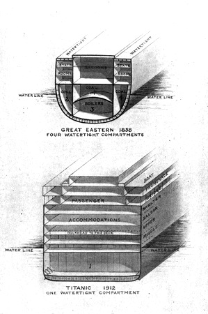 IV. That such design and construction are possible is proved by the fact that the first of the large ocean liners, the Great Eastern, built over half a century ago, so far fulfilled these conditions, that, after receiving injuries to her hull more extensive than those which sank the Titanic, she came safely to port.