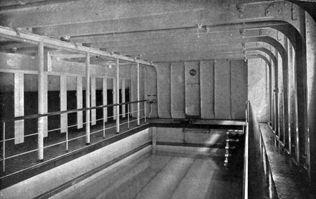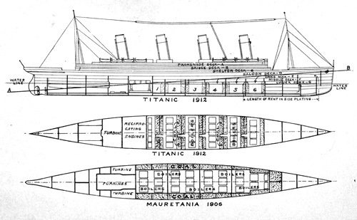 Now, all of these bulkheads are carried up to a watertight connection with the upper deck, which, amidships, is over two decks, or say about 20 feet above the water-line, the exception being the first or collision bulkhead, which extends to the shelter deck. A most important feature of the protection, borrowed from warship practice, is that the lower deck, which, amidships, is located at about the water-line, is built of extra heavy plating, and is furnished with strong watertight hatches. It thus serves the purpose of a protective deck, and water, which flooded any compartment lying below the water-line, would be restrained by this deck from finding its way through to the decks above. The Mauretania, therefore, could sustain an enormous amount of damage below the water-line without foundering. It is our belief that she would have survived the disaster which sank the Titanic. The first three compartments would have been flooded, it is true, but the water would have been restrained from her large forward boiler-compartment by the "inner skin" of the starboard bunkers. Furthermore, the watertight hatches of her lower, or protective, deck would have prevented that upward flow of water on to the decks above, which proved so fatal to the Titanic.