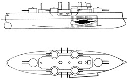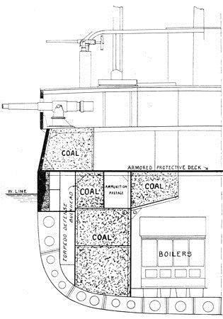 This well-protected ship has side coal bunkers, and inner skin in engine-rooms. There are thirty-three compartments below the water-line.