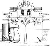 The most perfect example of protection by subdivision of the hull into separate compartments is to be found in the warship. It is safe to say that there is no feature of the design to which more careful thought is given by the naval constructor than this. Loss of stability in a naval engagement means the end of the fight so far as the damaged ship is concerned. Nay, even a partial loss of stability, causing the ship to take a heavy list, may throw a ship's batteries entirely out of action, the guns on the high side being so greatly elevated and those on the low side so much depressed, that neither can be effectively trained upon the enemy. Furthermore, deep submergence following the entrance of large quantities of water, will cut down the ship's speed; with the result, either that she must fall out of line or the speed of the whole fleet must be reduced.