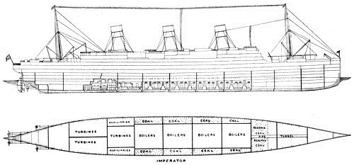 Special interest attaches to the Imperator of the Hamburg-American Line, just now, because she is the latest and largest of those huge ocean liners, of which the Olympic and Titanic were the forerunners. This truly enormous vessel, 900 feet long and 96 feet broad, will displace, when fully loaded, 65,000 tons, or 5,000 tons more than the Titanic. A study of her hold plan and inboard profile, shown on page 163, proves that it is possible to provide for an even larger boiler and machinery plant than that of the Titanic, without making any of that sacrifice of safety, which is so evident in the arrangement of compartments and bulkheads on the Titanic. Not only are the bulkheads throughout the machinery and boiler compartments carried to the second deck above the water-line, but the same spaces, throughout their whole length, are protected by an inner skin in the form of the longitudinal bulkheads of the side bunkers. The large forward engine-room is also protected by two longitudinal bulkheads at the sides of the ship and the after engine-room is divided by a central longitudinal bulkhead. Protection against the spread of fire is assured by several bulkheads worked across the decks which are devoted to passenger accommodation.