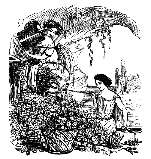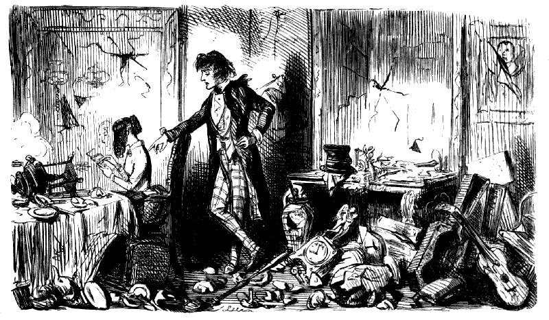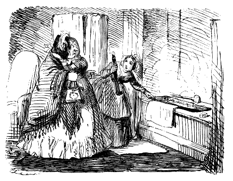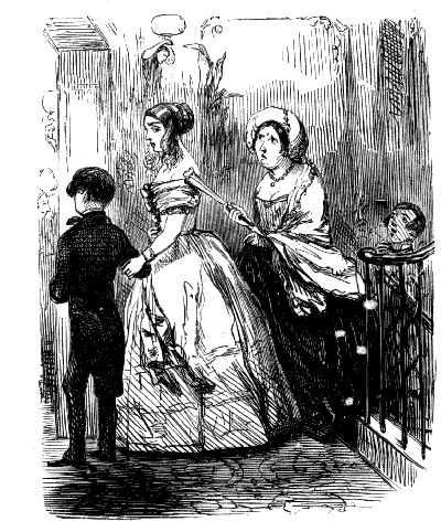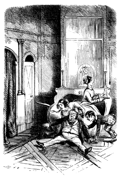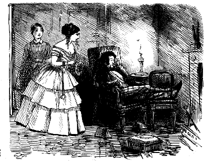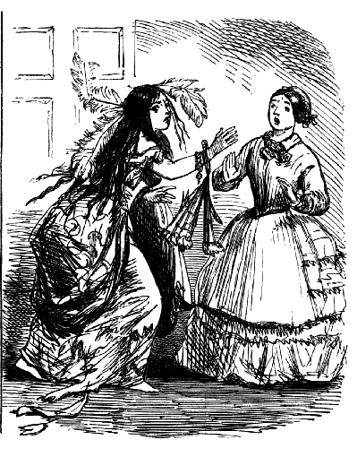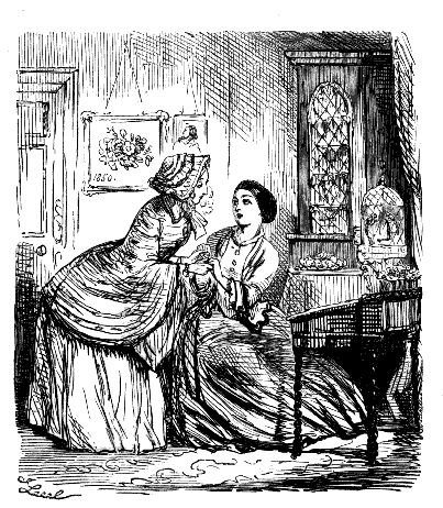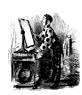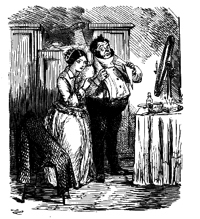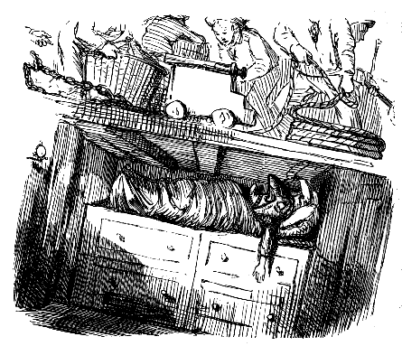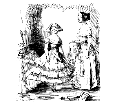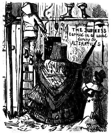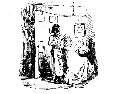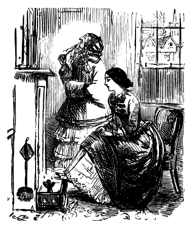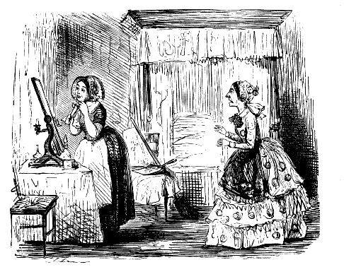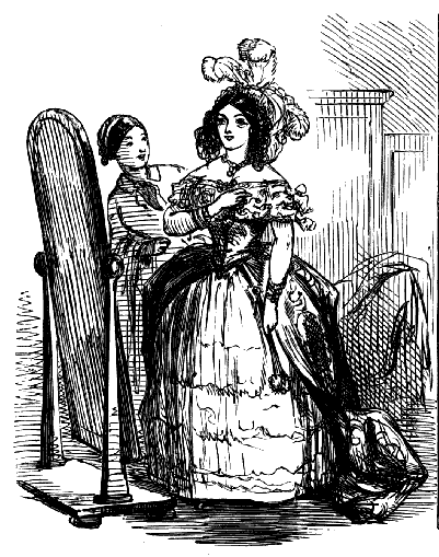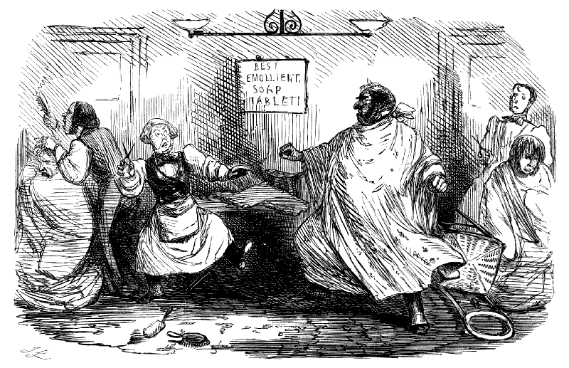Harriet. "ST! ST! ST! DEAR ME, NOW, I'VE BROKEN MY COMB, AND ALL MY BACK HAIR'S COME DOWN. WHAT WITH BRUSHING, AND DRESSING, AND CURLING, AND ONE THING AND THE OTHER, WHAT A PLAGUE ONE'S HAIR IS TO BE SURE!"