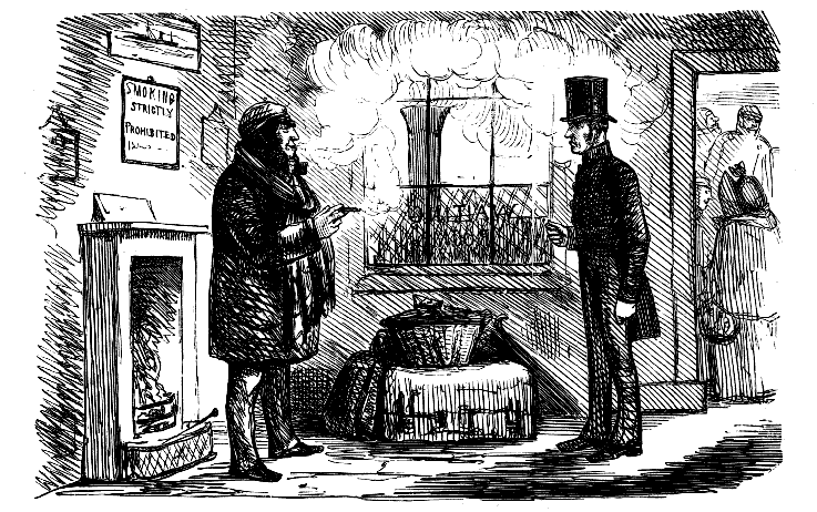 Passenger. "WHAT! SMOKING! THAT'S VERY REPREHENSIBLE. PERHAPS IT WAS THE CLERICAL GENTLEMAN WHO HAS JUST GOT OUT OF THE NEXT COMPARTMENT."
