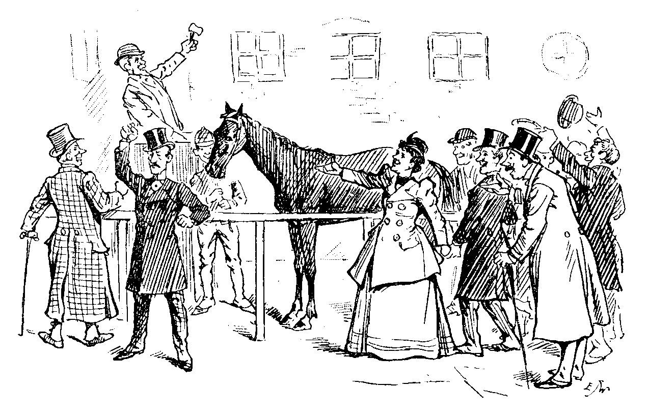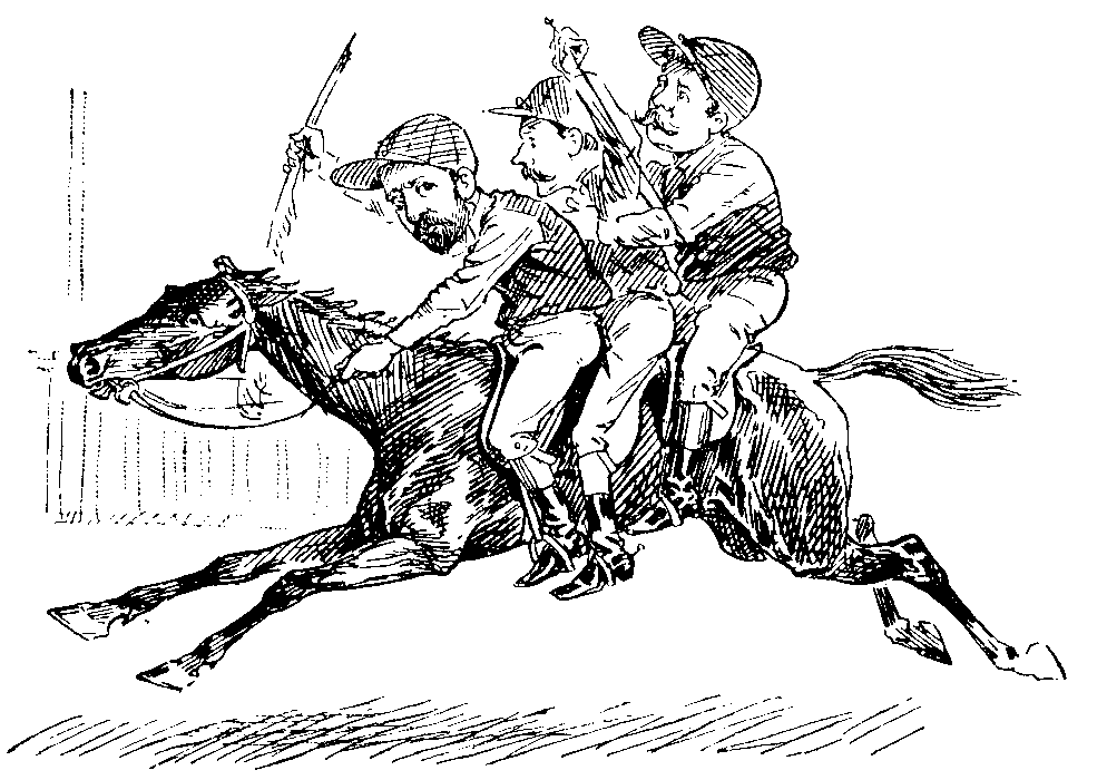 In the next Act we find that the Countess, in full ball costume, has eloped with the Villainous Major to a hotel. My Lady has allowed her companion to describe themselves as Mr. and Mrs. So-and-So in the porter's book. But thus far and no farther. When the Major politely begs the loan of her heart, the Countess bids him go, and treats him really with absolute rudeness. The Major, after a terrible struggle with my Lady, in which he gets the worst of it, is completely crushed, and probably inwardly laments the very considerable expense to which he must have been put by the elopement. At this crisis enter my Lord the hero. Row and tableau. After this, the audience feels that the correct prescription is to cut the dialogue and come to the "'osses." And to a great extent this prescription is adopted. There is a first-class scene of a sale at Tattersall's, and a very realistic view of the finish at the Derby. The throng cheer behind the curtain, and so does the throng in front of it. The task is complete: both sides of the green baize are crowded with excited people.
