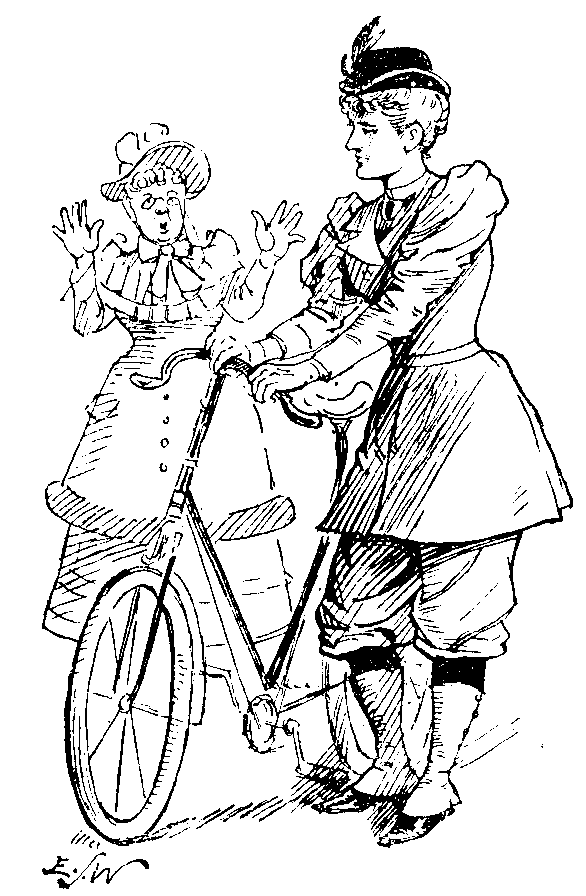 [A lady-bicyclist the other day, riding in "rational dress," was roundly hissed by an elderly Mrs. Grundy, standing by. The wheel-woman is said to have retorted, "Are you women who thus hiss me? When you bathe, you wear a special costume, which you deem suitable. When I ride, I do the same. Where's the difference?"]