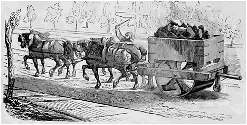 Le rouleau compresseur est un cylindre creux en fonte que l'on promène sur la chaussée jusqu'à ce que toutes ses parties soient enchevêtrées, liées et mastiquées ensemble à une profondeur égale à celle du lit de la chaussée. Les meilleurs rouleaux sont ceux qui, d'un poids de 6,000 kilog. environ, n'ont besoin que de six à huit chevaux pour les traîner. Ce sont des cylindres creux en fonte de 1 m. 30 c. de diamètre et disposés de manière à porter la charge dessus. Un poids supérieur à celui que nous indiquons et un plus grand nombre de chevaux, loin de comprimer la route et de réunir pour ainsi dire toutes ses parties en une seule surface adhérente, l'écrase, tandis que le passage et les efforts d'un trop grand nombre de chevaux dispersent les pierres que le rouleau compresseur a pour mission d'enchevêtrer et de transformer en une chaussée parfaitement unie.