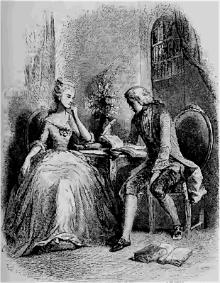 Il faut avouer, d'ailleurs, que M. Barbier n'a reculé devant aucun sacrifice pour satisfaire la passion favorite de ses souscripteurs; il leur donne chaque semaine, outre une feuille de texte parfaitement imprimée sur du beau papier, quatre ou cinq jolis dessins de MM. Em. Wattier, Karl Girardet, C. Roqueplan, E. Lepoittevin, T. Frère, H. Baron, etc., et un grand sujet, tiré à part sur papier de Chine, par Tony Johannot.--Les dessins ci-joins sont choisis au hasard parmi cette intéressante collection.--Voila d'abord Julie rêvant à Saint-Preux sous un bosquet, et Saint-Preux rêvant à Julie sur un banc. Ici les deux amants sont réunis: «Que mon rusé maître était timide alors, écrivait Julie, qu'il tremblait en me donnant la main pour sortir du bateau. Ah! l'hypocrite, il a beaucoup changé!» M. Tony Johannot nous les montre ensuite faisant ensemble quelque lecture aussi dangereuse que celle qui perdit Françoise de Rimini et son malheureux amant; enfin Julie, à genoux, écrit à Saint-Preux, en baignant son papier de ses larmes et en élevant à lui ses supplications.