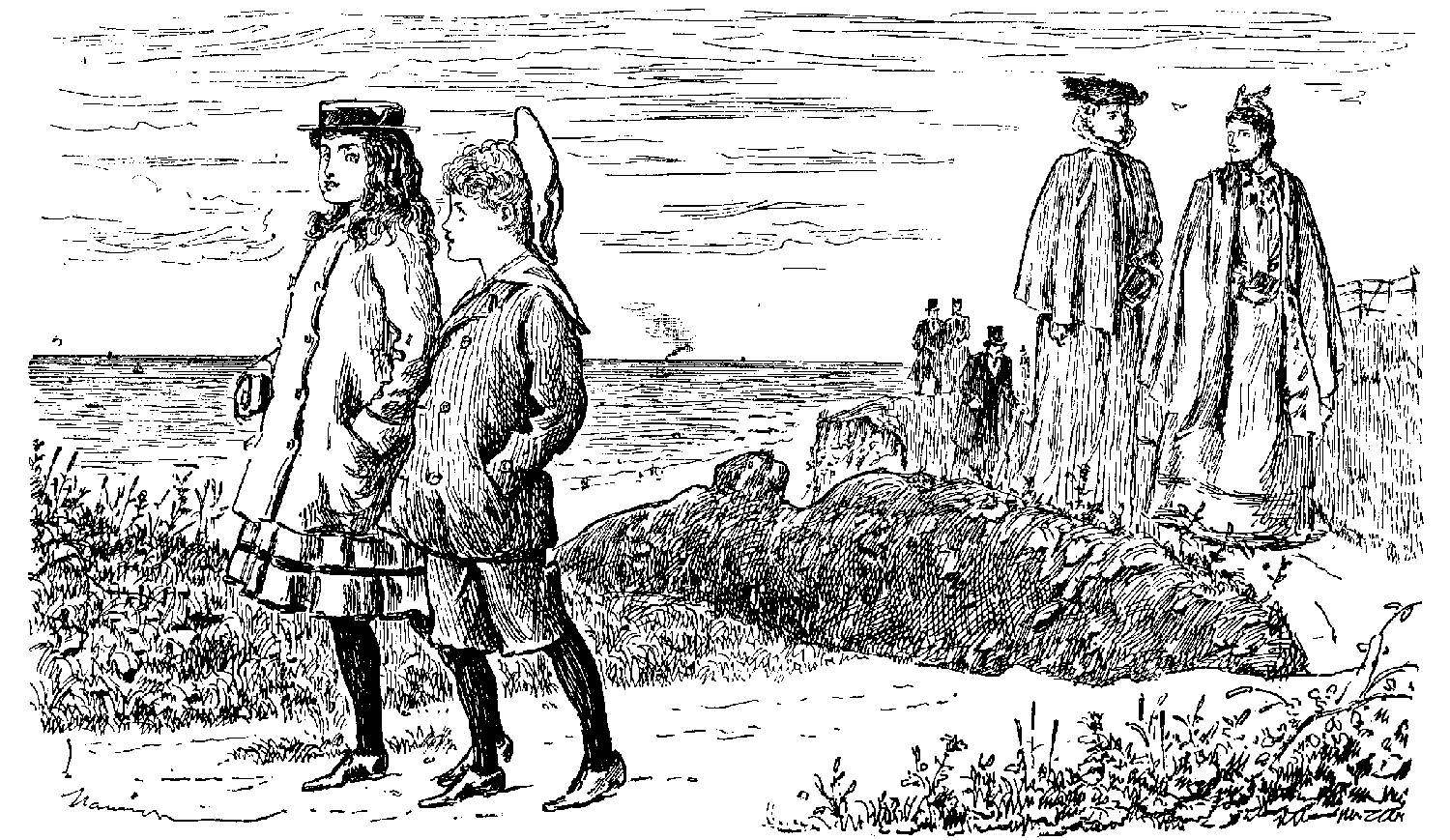 What amusing nights and delightful days! The ladies—bless 'em!—all charming, and very Barkisses in their perpetual "willingness" to do anything and everything that might give pleasure and afford amusement. Two fairy-gifted maidens entertain us mightily with a capital dramatic sketch of their own composition; others follow suit, playing the piano; and a sestette perform, without previous rehearsal, glees, madrigals, part-songs, and choruses to popular plantation melodies, under the leadership of that masterly musician Tom Tolderol, whose only regret is that he has not been able to bring on board with him his sixteen-horse-power-fifty-stopped-sixteen-pedal organ (designed and made by the eminent firm of Bellows, Blower & Co., at a cost of some few thousand pounds), though, as he explains to us, he would have done so, had this musical mammoth been only compressible within the limits of an ordinary carpet bag.