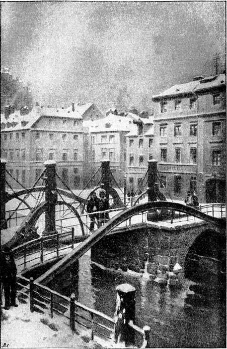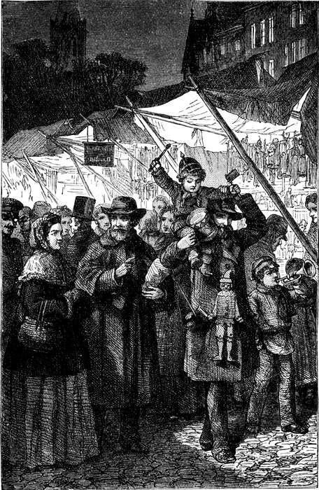 An den Fenstern erscheinen lachende Kindergesichter, kleine Händchen klatschen fröhlich zusammen: welche Gedanken an weiße Dächer und grüne funkelnde Tannenbäume! Wie phantastisch die Sperlingsgasse in dem wirbelnden weißen Gestöber aussieht! Wie die wasserholenden Dienstmädchen am Brunnen kichern! Der fatale Wind! —