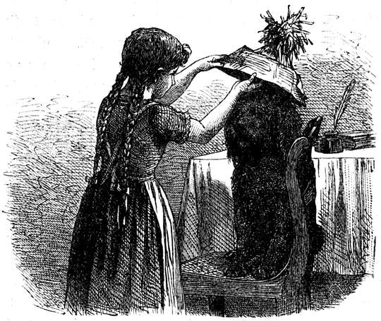 Da kommt der Lehrer selbst, seine Bücher unter dem Arm; aufmerksam betrachtet er das Zerschmelzen einer Flocke auf seinem fadenscheinigen schwarzen Rockärmel. Jetzt ist die Zeit für einen Märchenerzähler, für einen Dichter. — Ganz aufgeregt schritt ich hin und her; vergessen war die böse Zeit; auch mir war, wie weiland dem ehrlichen Matthias, ein großer Gedanke „aufs Herz geschossen“. „Ich führe ihn aus, ich führe ihn aus!“ brummte ich vor mich hin, während ich auf und ab lief; wie verwundert mich auch alle meine Quartanten und Folianten von den Büchergestellen anglotzten, wie spöttisch auch das Allongeperückengesicht auf dem Titelblatt der dort aufgeschlagenen Schwarte hergrinzte!