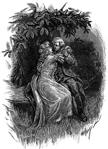 In these lover-like communings the night sped quickly, and over the tree-tops came the silver streaks in the clouds which herald the approach of dawn. They knew that their remaining time must now be short, and for a while they spoke no words. Still they sat side by side upon the bench, Maurice holding Gabrielle's hand folded within his own. Motionless, and with her head leaning forward, she wept in silence, tears of mingled joy and anguish. Maurice felt a strange thrill of rapture in his heart as he gazed in the sweet face of his beautiful betrothed, illumined by the soft rays of the moon, and as if seized with a sudden impulse, he fell upon his knees before her.