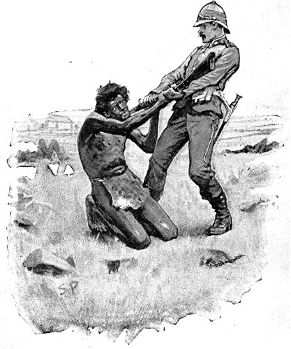 When the patients had been got into the next room I followed, dragging the man with the broken leg after me. I stopped at the hole to guard it whilst Williams was helping the patients through a window into the other defences. I stuck to my particular charge, and dragged him out and helped him into the inner line of defences. I then took my post behind the parapet where three men had been hit just before. One of these was shot in the thick part of the neck, and was calling on me all night to shift from one side to the other. On this side the blaze of the hospital lighted up the ground in front, enabling us to take aim. The Zulus would every quarter of an hour or so get together and make a rush accompanied by yells. We let them get close, and then fired a volley—sometimes two. This would check them and send them back. Then after a time they would rally and come on again. About 3 a.m. day began to break, and the Zulus retreated. A party, of which I was one, then volunteered to go across to the hospital, where there[Pg 550] was a water cart, and bring it in to the inner enclosure, where there was no water, and the wounded were crying for it. When the sun rose we found the Zulus had disappeared. We then went out to search for our missing comrades. I saw one man kneeling behind the outer defences with his rifle to his shoulder, and resting on the parapet as if he were taking aim; I touched him on the shoulder, asking him why he didn't come inside, but he fell over, and I saw he was dead. I saw several others of our dead ripped open and otherwise mutilated. Going beyond the outer defences I went, as I have said before, whither I had killed the man at whom I had fired three shots from the hospital. Going on a little further I came across a very tall Zulu, bleeding from a wound in the leg; I was passing him by when he made a yell and clutched the butt of my rifle, dragging himself on to his knees. We had a severe struggle which lasted for several seconds, when finding he could not get the rifle from me, he let go with one hand and caught me round the leg, trying to throw me. Whilst he was doing this I got the rifle from him, and drawing back a yard or two, loaded and blew his brains out. I then was fetched back to the fort, and no one was allowed to go out save with other men. Then several of us went out together, and we brought in several wounded Zulus. By this time it was about eight or nine o'clock, and we saw a body coming towards us; at the same time Lord Chelmsford's column came in sight, and the enemy retired.