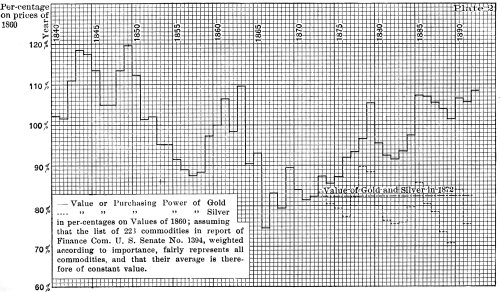 It must not be supposed that this plan contemplates any control of individual prices. Such will be free to fluctuate in accordance with the law of supply and demand, as they now and ever must do, regardless of the monetary system used. It would not be desirable, even if it were possible, to make individual prices constant; but what is desirable and possible, and what it is believed this system would accomplish, is to relieve the prices of all commodities from the fluctuations due to changes in value of the one commodity by which all others are measured; to make the money—the one commodity which174 no one wants except for measuring the value of and exchanging for other commodities—of constant value. The prices and values of gold and silver would then depend on their use for other than money purposes, or for money purposes in other countries, and if the value of either metal should fall, or fail to continue to rise, there would be no room for complaint that it was being discriminated against by the laws, since all commodities would be treated alike, and the demand for none increased over what it would otherwise be by its selection for monetary uses.
