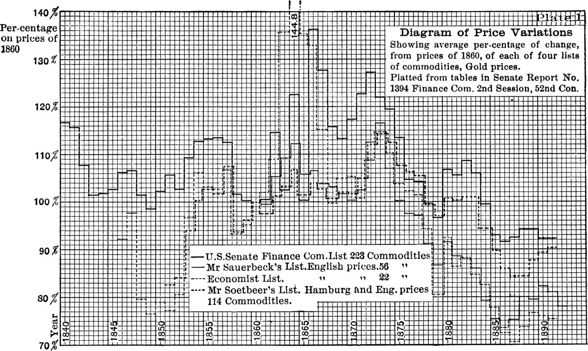 in per-centages on Values of 1860; assuming that the list of 223 commodities in report of Finance Com. U. S. Senate No. 1394, weighted according to importance, fairly represents all commodities, and that their average is therefore of constant value.