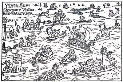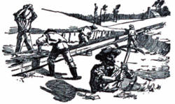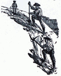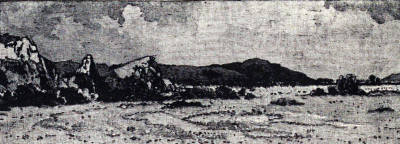 Go over the next ridge, or perhaps the one beyond that,[226] and you will see a still stranger sight—a great, black, angular dredge, a one-armed iron giant scooping up the sand tons at a time, in his huge palm, weighing it in the air, and then, with outcrooking elbow, majestically dropping it upon the desert. There is a little black engine behind burning mesquit-wood, and a silent, grimy man chewing tobacco and grumbling at the heat. They entered the desert forty miles away at the bank of a great river, and they have burrowed their way through the sand, with the water following in a broad brown band.