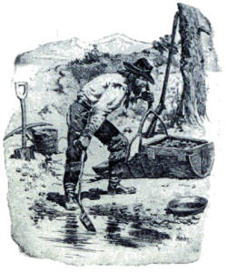 The picturesque features of life in a Western Montana town like Missoula are best seen as evening approaches. Crowds of roughly clad men gather around the doors of the drinking-saloons. A group of Indians, who have been squatting on the sidewalk for two hours playing some mysterious game of cards of their own invention, breaks up. One of the squaws throws the cards into the street, which is already decorated from end to end with similar relics of other games. Another swings a baby upon her back, ties a shawl around it and herself, secures the child with a strap buckled across her chest, and strides off, her moccasined feet toeing inward in the traditional Indian fashion. She wears a gown made of a scarlet calico bed-quilt, with leggings of some blue stuff; but she has somehow managed to get a civilized dress for the child. They all go off to their camp on the hill near by. Some blue-coated soldiers from the neighboring military post, remembering the roll-call at sunset, swing themselves upon their horses and go galloping off, a little the worse for the bad whisky they have been drinking in the saloons. A miner in blue woolen shirt and brown canvas trousers, with a hat of astonishing dimensions and a beard of a year's growth, trots up the street on a mule, and, with droll oaths and shuffling talk, offers the animal for sale to the crowd of loungers on the hotel piazza. No one wants to buy, and, after provoking a deal of laughter, the miner gives his ultimatum: "I'll hitch the critter to one of them piazzer posts, and if he don't pull it down you may[207] have him." This generous offer is declined by the landlord; and the miner rides off, declaring that he has not a solitary four-bit piece to pay for his supper, and is bound to sell the mule to somebody.