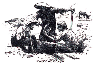 Who can convey the feeling of the mysterious night on the desert, suddenly and sweetly cool after the burning heat of the day, the sky a deep, clear blue above—nowhere so blue as in this dry, pure air—the stars almost crowding down to earth in their nearness and brilliancy, a deep and profound silence round about, broken occasionally by the far-off echoing scream of some prowling coyote or the hoot of an owl? The horses loom big and dark where they feed in the near distance; here and there on the top of a dry yucca-stalk an owl or a hawk sits outlined in black against the sky; otherwise there is nothing anywhere to break the long, smooth line of the horizon.