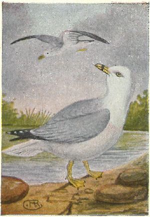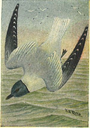 GULLS, TERNS. Family Laridæ:—Gulls have hooked bills, usually yellowish, yellow eyes and pale, webbed feet. Heap, underparts and square tail are white in adults; back, pearl-grey; exceptions are the four small black-headed gulls, which also have reddish legs. Gulls fly with the bill straight in front, and often rest on the water. Terns have forked tails, black caps, and their slender, pointed bills and small webbed feet are usually red. They fly with bill pointed down, and dive upon their prey.