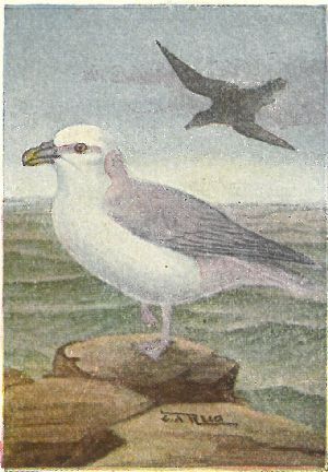 FULMARS, SHEARWATERS, PETRELS. Family Procellariidæ:—Nostrils opening in a tube on top of the hooked bill. Plumage of fulmars, gull-like; shearwaters [11] entirely sooty black, or white below; petrels blackish, with white rumps,—very small birds. All seabirds.