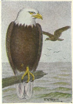 Legs not feathered to the toes. Adults with white head and tail. Young birds similar in color to those of the Golden Eagle, but blacker and with the legs always bare on the lower half. Young, with brown eyes, like those of the last; adults with yellow eyes and feet. This handsome bird of prey, our national emblem, is resident and locally distributed throughout the United States and Canada, always near streams or lakes, and most abundant on the seacoasts. Their food, like that of the Golden Eagle, is chiefly caught by themselves, and consists of any small mammals, geese, ducks, etc., and during the summer, or when their usual food is scarce, they feed upon fish, which they either catch for themselves or taken by force from Ospreys.