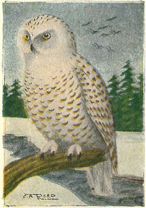 No ear tufts. Plumage white, more or less heavily spotted with black, the female usually being quite strongly barred on the back. They are locally abundant in the far north, preferring low, mossy lands to the more timbered districts. Here they find an abundance of food during the summer months, living upon hares, lemmings, ptarmigan and ducks. They are about the equal of the Horned Owl in strength, and usually will weigh a few ounces more; they will frequently kill animals or birds as heavy, or heavier, than themselves. They also catch a great many fish; these they get in shallow water among the rock-weed covered stones, by reaching down quickly and seizing their prey in their strong claws.
