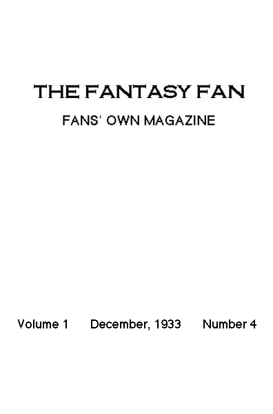 For some reason known only to themselves, Weird Tales has refused to accept the TFF ad for their January, 1934 issue. Perhaps they think they have competition! We had intended to make our January number entirely weird with 24 pages, but now find it inadvisable, because of the rejection of our ad. We find that it would be best to conserve the Fantasy Fan Fund for future issues, rather than put everything into one issue.