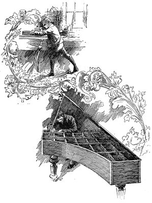 Let us now take a glance at the workshop, where the boys are using plane and chisel, pointing and dovetailing pieces of wood which not only answer ends in themselves, but the treatment of which serves to make the blind useful with their hands. They seldom cut their fingers, extra care no doubt giving greater immunity. Another workshop near at hand is occupied by young men perfecting themselves in all the branches of pianoforte making and tuning. They learn to do everything, from tightening a wire to putting a new one in, and hundreds of testimonials from those who have employed blind tuners speak for the thoroughness with which they do their work. To enable the learners to familiarise themselves with the parts of an instrument, Messrs. Broadwood made specially for them a model which can be taken to pieces and put together again till they know all about it. The interest which Messrs. Broadwood have shown in the College has assumed very practical shape, and it is noteworthy that among the employés of the firm is an old pupil of Dr. Campbell's.