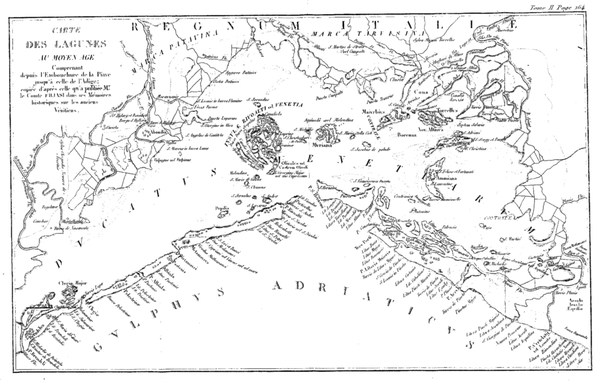 On ajouta à ces dispositions en 1367, que dans les conseils le doge ne pourrait jamais être d'un avis contraire à celui des avogadors; parce que ceux-ci étaient spécialement chargés de voter pour l'intérêt de la république. On descendit jusqu'à des soins minutieux pour lui imposer (p. 43) des entraves. On fixa la somme à mettre à sa disposition pour la réception des étrangers de marque, et il fut réglé que cette somme ne pourrait excéder mille livres par an. On ajouta que, dans les six premiers mois de son élection, il serait obligé de se faire faire au moins une robe de brocard d'or, qu'enfin, ni lui, ni ses enfants, ni sa femme, ne pourraient recevoir aucun présent, tenir aucun fief, ni cens, ni emphytéose, posséder aucun immeuble hors des limites du duché et que s'ils en possédaient ils seraient obligés de les vendre. Or si on considère que le territoire appelé le Dogado ne comprenait que la capitale, les îles de Malamocco, de Chiozza et de Brondolo et une lisière de côtes depuis l'embouchure du Musone vis-à-vis Venise, jusqu'à celle de l'Adige, on reconnaîtra que les familles puissantes qui pouvaient prétendre à cette suprême dignité, s'imposèrent à elles-mêmes une notable gêne, en s'interdisant toutes possessions hors de ces étroites limites[11].