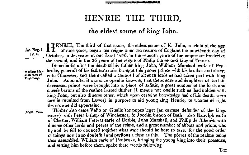 Henrie, The third of that name, the eldest sonne of K. John, a child of the age of nine yeres, began his reigne ouer the realme of England the ninetéenth day of October, in the yeare of our Lord 1216, in the seuenth yeare of the emperour Frederike the second, and in the 36 yeare of the reigne of Philip the second king of France.