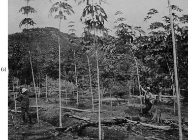 There are differences of opinion as to the career of the seedlings which went to Singapore. It is known that as early as 1880, some Hevea trees were in flower at Perak, a mid-region of the Malay Peninsula, and that in 1881 some of those in the Botanic Gardens at Singapore, in the south of the Peninsula, bore fruit. These trees may have been reared from Kew seedlings; or they may have been grown from cuttings of the young trees at Peradeniya, sent over to Singapore in 1877; or, again, they may have been transplanted one-year-olds from Ceylon. In any case, Heveas in the Malay Peninsula were yielding seed as early as their near relatives in Ceylon. And it is the seed supply of these two countries that has brought into existence the numerous and vast rubber plantations that now occupy a very large area of the Eastern Tropics.