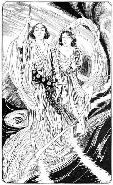 From this time their kingdom was divided from the lower world where chaos still prevailed. To the fourth pair of gods it was given to create the earth. These two beings were the powerful God of the Air, Izanagi, and the fair Goddess of the Clouds, Izanami. From them sprang all life.
