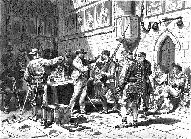 La junte, composée d'ouvriers, siégeait dans la cathédrale. Le lieu de ses séances était la chapelle des apôtres, située au fond de la nef, à gauche. On y pénétrait par une grande porte cintrée, que gardait un certain nombre d'hommes armés. Rien de sinistre et de grotesque à la fois comme cette assemblée d'hommes en blouses plus ou moins malpropres, ou en manches de chemises, jeunes pour la plupart, tous fatigués, discutant et fumant des cigarettes autour d'une table surchargée de papiers. Entre ces hommes et la série des portraits d'évêques crosses et mitres garnissant les murs de la chapelle, quel contraste! Il m'a été donné de voir le tableau, et de ma vie je ne l'oublierai. Il n'était pas d'ailleurs difficile de pénétrer dans ce sanctuaire momentanément transformé en caverne. Le mot est trop fort, car on n'y courait vraiment aucun risque d'être dévoré. Tous les membres de ce singulier gouvernement visaient même à l'urbanité et prenaient des airs de gentlemen. Il est vrai d'ajouter qu'au moment où je les vis, malgré l'assurance qu'ils affectaient encore, ils étaient visiblement découragés. C'était le 4 août. La canonnade avait déjà fait beaucoup de ruines par la ville et les notables devenaient menaçants. Le 5, il fallut décidément aviser. Une commission fut envoyée au général Campos et un armistice conclu. La junte demandait une amnistie pour les insurgés; mais voyant qu'il n'y avait guère d'apparence qu'elle fut accordée, elle convoqua cinq volontaires par bataillon pour prendre une résolution suprême. Elle était déjà décidée à abandonner la partie, et ce qui le prouve c'est que les volontaires s'étant prononcés pour la continuation de la résistance, tous ses membres profitèrent de la nuit pour quitter la ville et gagner le Grao, où les attendait un steamer qui devait les conduire à Carthagène.