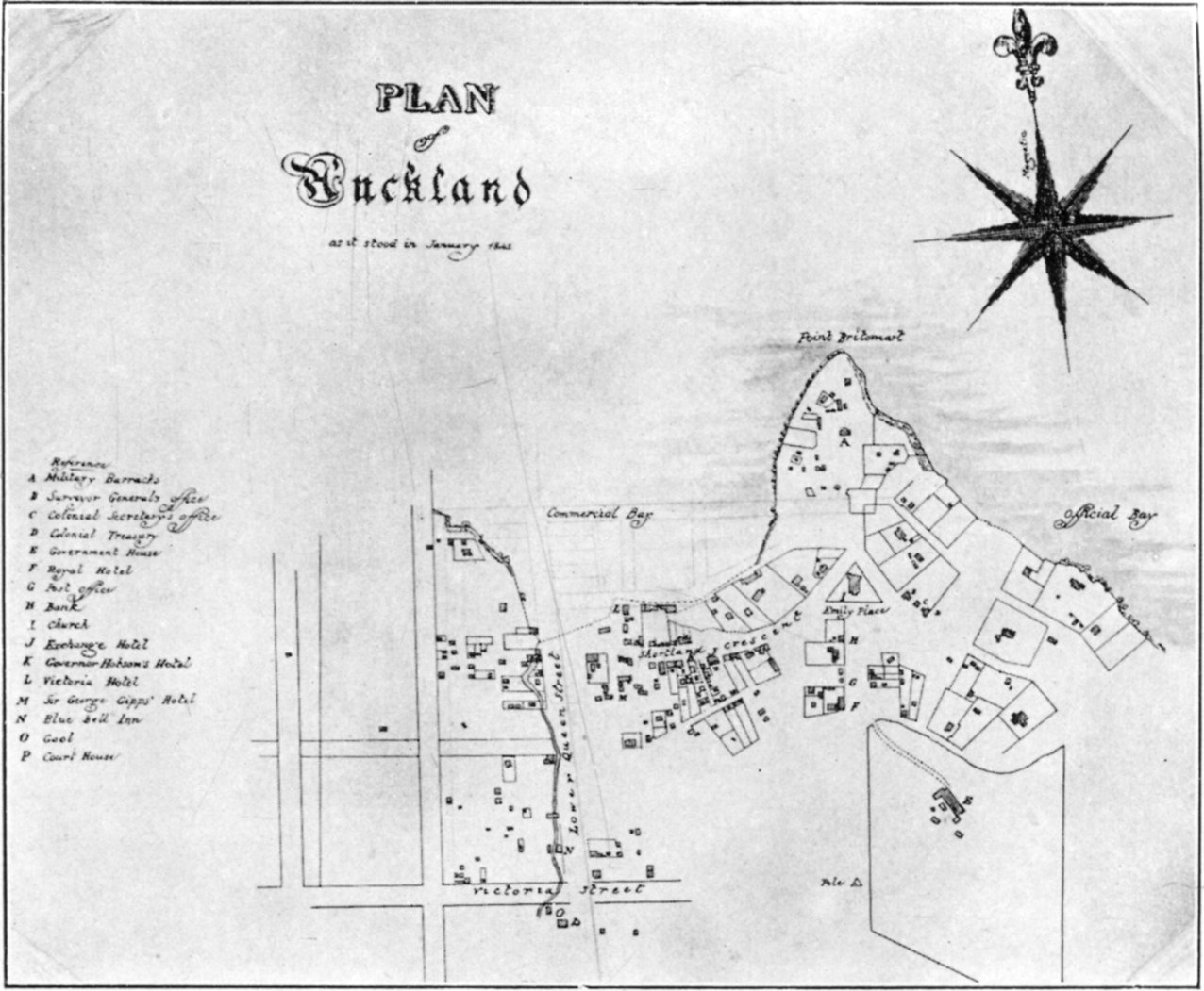 [21] Albert Barracks occupied the area bounded by Kitchener Street as far as Victoria Street, then followed an irregular line to Symonds Street at the point where Grafton Road now intersects, thence along Symonds Street to O’Rorke Street, and back on a line bordering Wellesley Street to the starting point at Kitchener Street. In 1871 the Barracks were transferred from the Government to the City Corporation.