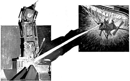 Und nachts, wenn Millionen von Lichtern den Himmel erhellen, und durch ihr vereintes Feuer weit in das Dunkel umher eindringen werden, dann wird die Stadt einer ungeheueren Fackel gleichen, um die schnell vorwärtsstrebende Flugmaschinen, riesigen Motten gleich, vorbeihuschen und verschwinden werden.