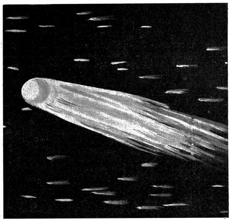 Sollte der Kern eines Kometen irgend eine Stadt treffen, so würden die Astronomen in der Lage sein, sie vielleicht noch rechtzeitig zu warnen und mehrere Stunden vor dem wirklichen Zusammenstoß würden die entsetzten, schreckgelähmten Bewohner die „Geschosse“ ihres Feindes am Horizont emporsteigen und größer und größer werden sehen. Bei Tage würden sie schwarz aussehen wie Kohle, und sie würden von einer Dunsthülle umgeben sein, die in demselben Augenblicke, wo sie mit unserer Atmosphäre zusammentrifft, in Flammen aufgehen würde.