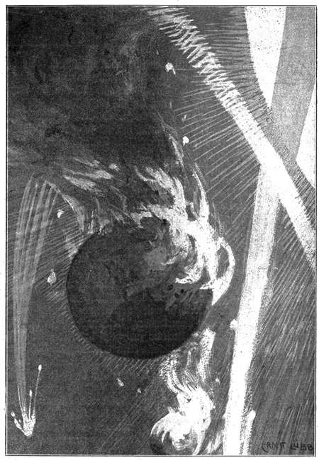Es unterliegt wohl kaum einem Zweifel, daß die Sonne von unserem Sonnensystem die erste wäre, die den Zusammenstoß mit dem fremden Weltkörper erhalten müßte. Das kommt daher, daß das ganze System nicht staffelweise, sondern flach durch den Raum eilt; und infolgedessen würde sein Zentrum als der förmliche Brennpunkt der gesamten Anziehungskraft zuerst dem selbst mitangezogenen fremden Körper entgegengeschleudert werden. Dieser Körper würde, soweit wir die toten Sterne bisher berechnen können, die Sonne an Massigkeit weit überragen oder ihr zum mindesten gleich sein. Wenn sie nun mit einer Geschwindigkeit von vielen hundert Meilen in der Sekunde aufeinander zustürzen würden, dann würde er in der furchtbaren Hitze, die sich dadurch allein schon entwickeln würde, schmelzen wie Wachs. Wir selbst und all die anderen Planeten würden in ein Feuerbad gestürzt werden, das eine Temperatur von einer Million Grade haben würde. Einen Augenblick, bevor diese Hitzewelle uns treffen würde, würden unsere Städte, unsere Hügel und Berge gegen den Himmel emporragen, und einen Augenblick später werden sie nichts anderes als ein Meer von Dunst und Dampf sein.