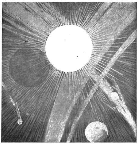 Es ist eine übermächtige Aetherströmung, in welcher Sonnen und Planeten ebenso machtlos sind, wie es eine Nußschale wäre, die man in den Strudel der Niagarrafälle werfen würde. Und nicht nur unsere eigene Sonne und unser eigenes Sonnensystem wird von dem tollen Strome erfaßt, sondern auch viele andere große Sterne und Sternensysteme, die mit den unsern demselben, geheimnisvollen Schicksal entgegengehen.