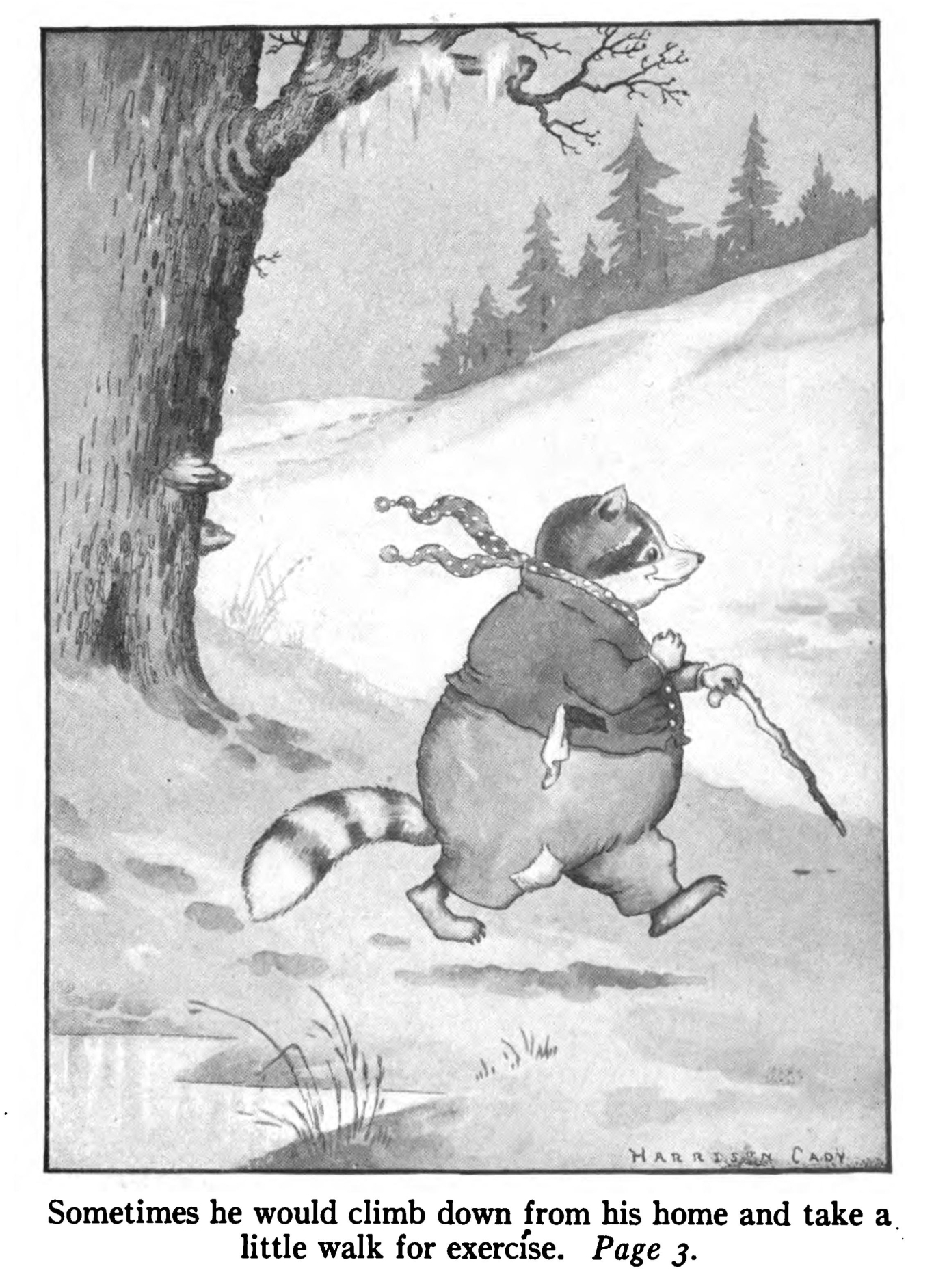Bobby had kept awake as long as there was anything to eat, but when Jack Frost froze everything hard, and rough Brother North Wind brought the storm-clouds that covered the Green Forest with snow, Bobby climbed into his warm bed inside the big hollow chestnut tree which he called his, curled up comfortably, and went to sleep. He didn't care a hair of his ringed tail how cold it was or how Brother North Wind howled and shrieked and blustered. He was so fat that it made him wheeze and puff whenever he tried to hurry during the last few days he was abroad, and this fat helped to keep him warm while he slept, and also kept him from waking from hunger.