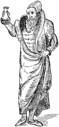 One of the earliest magicians or soothsayers of which we have record out of the era of mythology was Tiresias. He lived in the times of Œdipus and the war of the seven chiefs against Thebes. For having offended the gods he was visited with blindness, but being repentant, tradition states they recompensed him for this affliction by endowing him with the gift of prophecy and the act of divination. He is also said to have been able to hold communion with the feathered world, and to have power over the spirits of the dead, whom he could compel to appear and reply to his inquiries. His incantations and spells were supposed to be irresistible, and he could foretell future events by signs from fire, smoke, and other methods of divining.