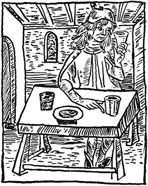 The proprietor himself, we are told, might have been forty-five years of age. “He was of middle height, his face was thin, his nose very much hooked, his eyes small and piercing, with[330] a good-humoured twinkle in them. His mouth was large and drawn down at one corner. He was stout in his body, and carried a considerable protuberance before him, which he was in the habit of patting with his left hand complacently. But although stout in his body, his legs were mere spindles, so that in his appearance he reminded you of some bird of the crane genus.
