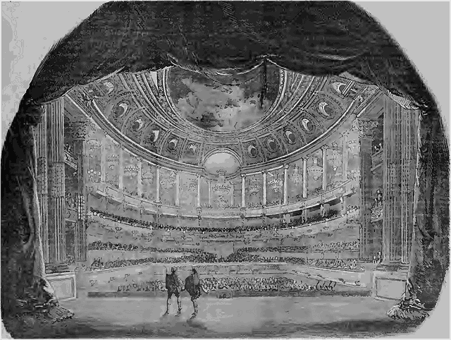 A sept heures et demie, le roi a paru dans sa loge accompagné de toute la famille royale, excepté le duc d'Aumale, qui guerroie en Afrique. M. le comte de Syracuse, frère du roi de Naples, M. le prince Alexandre de Wurtemberg gendre du roi Louis-Philippe, complétaient le groupe royal et princier.