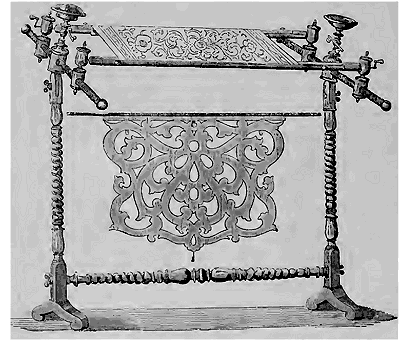 Après avoir passé en revue les hauts produits du lainage, qu'on nous permette d'offrir à nos lectrices un métier à tapisserie, invention nouvelle d'une demoiselle qui, frappée des mouvements du métier ordinaire, qu'on devait monter et démonter et faire mouvoir dans tous les sens, à l'aide de lourdes vis, disgracieusement placée» dans de jolies mains, a imaginé un mécanisme aussi ingénieux que simple qui permet de monter et démonter, tendre et détendre avec facilité l'étoffe dans tous les sens. Par un autre procédé, ce métier présente un support pour le modèle et un cadre à quadrillé pour reproduire et nuancer un dessin donné. Cet appareil est dû à mademoiselle Chanson.