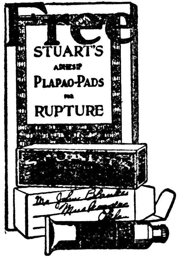 Yes, stop it, you know by your own experience it is only a make-shift, a false prop against a collapsing wall, and that it is undermining your health. Why, then, continue to wear it? Here is a better way, which means that tiresome, torturous trusses can be thrown away forever, and it's all because Stuart's PLAPAO-PADS are different, being medicine applicators made self-adhesive purposely to prevent slipping and to afford an arrangement to hold the parts securely in place.