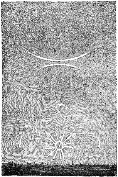 The loftiest atmospheric phenomenon that we can observe directly is the aurora, which has been photographed up to heights of more than 300 miles. The altitude of the aurora is determined by simultaneous observations made at two or more points, and the same is true of shooting stars and their trails, which seem to be especially numerous between the levels of sixty and ninety miles. The so-called “noctilucent clouds,” which shone by reflected sunlight throughout the night for some years after18 the great eruption of Krakatoa and were supposed to consist of fine dust from that volcano, were probably about fifty miles above the earth. From the duration of twilight we infer that above about forty-five miles the air is so tenuous that it cannot reflect sunlight to the earth. Clouds furnish information concerning the movements of the air at various levels up to ten miles or more. Observations on mountains contribute further to our knowledge of the atmosphere above the ordinary levels of habitation.